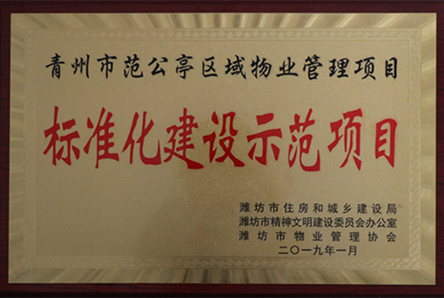2019年1月青州市范公亭區(qū)域物業(yè)管理項(xiàng)目被評(píng)為“標(biāo)準(zhǔn)化建設(shè)示范項(xiàng)目”。