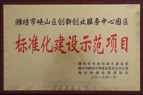 2019年1月濰坊市峽山區(qū)創(chuàng)新創(chuàng)業(yè)服務(wù)中心園區(qū)物業(yè)管理項(xiàng)目被評(píng)為“標(biāo)準(zhǔn)化建設(shè)示范項(xiàng)目”